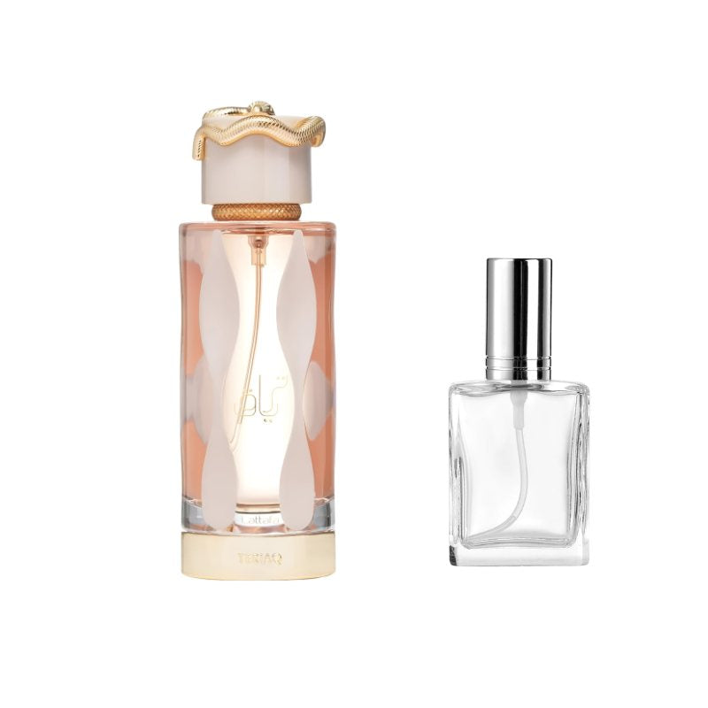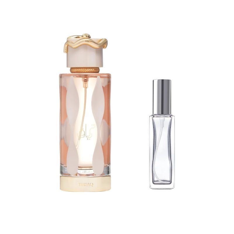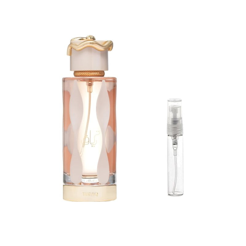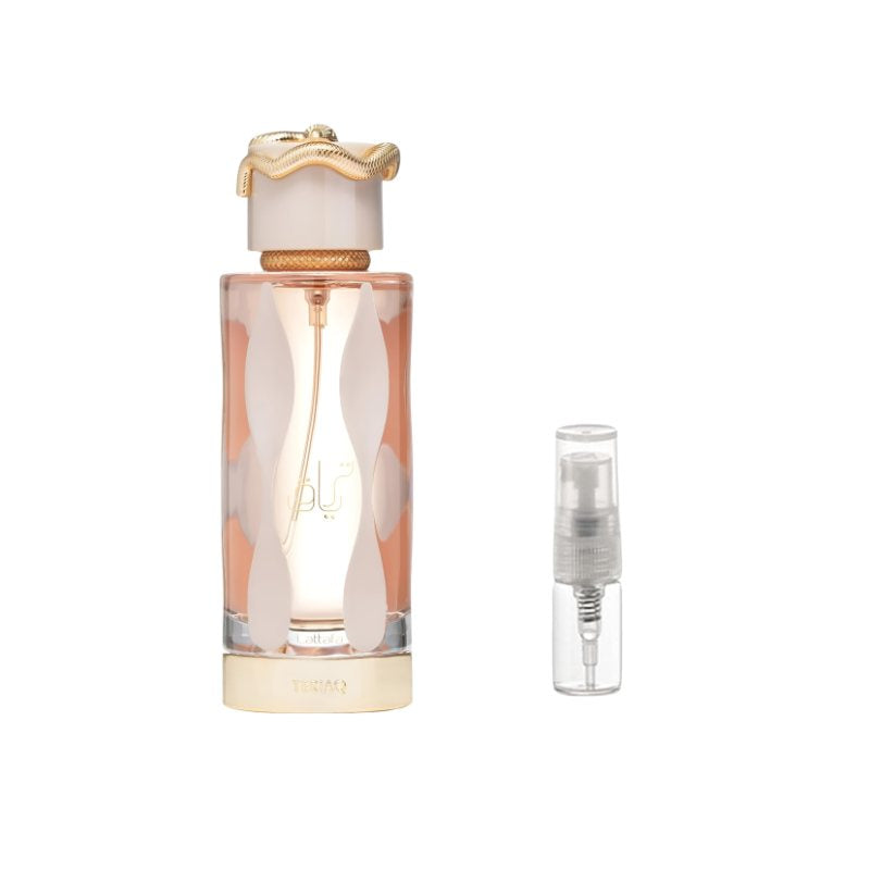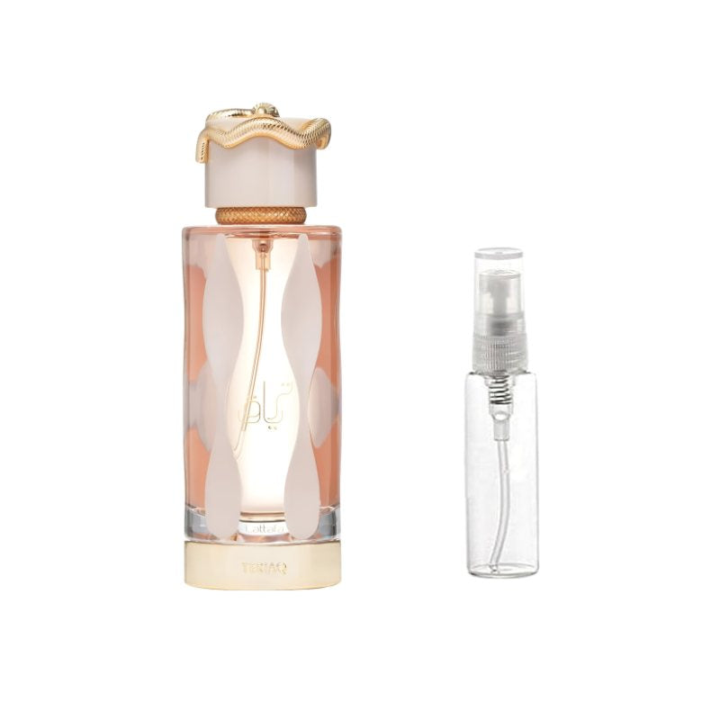 Lattafa Teriaq for Women Sample Discover the bold allure of Lattafa Teriaq for Women with this premium sample vial, designed to let you explore its captivating sweetness and depth. The fragrance opens with indulgent notes of caramel and golden honey, instantly wrapping you in a rich gourmand embrace. As it develops, warm cinnamon and amber mingle with smooth tonka bean, creating a sensual and comforting heart. The scent dries down to a luxurious base of vanilla, resins, and smoky woods, leaving behind a trail that is both sweet and mysterious. Perfect for evenings, special moments, or when you want a touch of elegance on the go, this sample lets you experience the irresistible charm of Teriaq without the full bottle commitment.