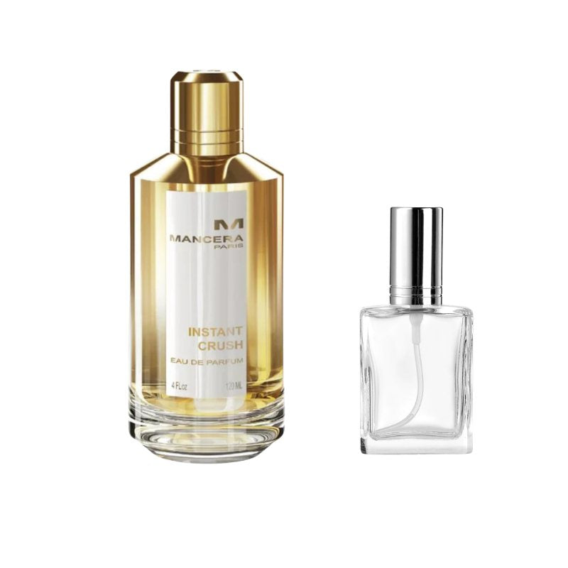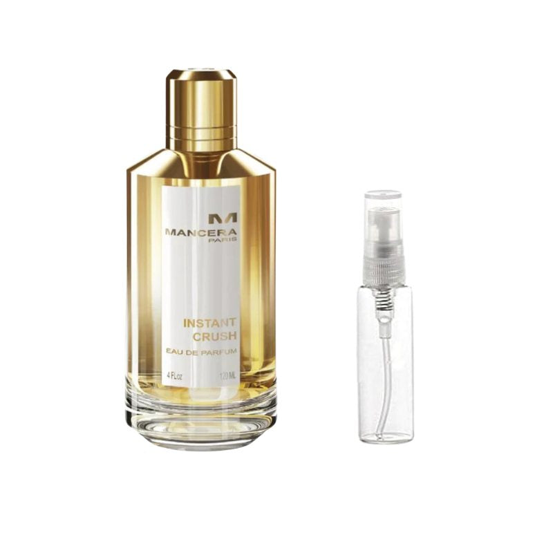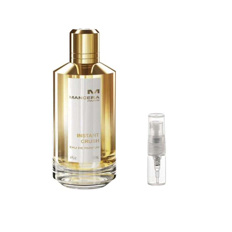 Mancera Instant Crush Sample Indulge in the captivating allure of Mancera Instant Crush with this premium sample vial, perfect for experiencing its luxurious blend before committing to a full bottle. Opening with a sparkling mix of saffron, ginger, and citrus fruits, the fragrance immediately draws you in with bold vibrancy. The heart unfolds with velvety rose, jasmine, and amberwood, adding depth and richness, while the base of vanilla, sandalwood, and musk creates a warm, sensual trail that lingers beautifully on the skin. Ideal for evenings, special occasions, or whenever you want to make a lasting impression, this sample lets you explore the irresistible charm of Instant Crush in a portable and convenient form.